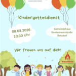 - Herzliche Einladung zum Kindergottesdienst am 08.03.2026kommt gerne vorbei. Eure Eltern könnt ihr gerne im Gottesdienst angeben. Es ist gut für sie!